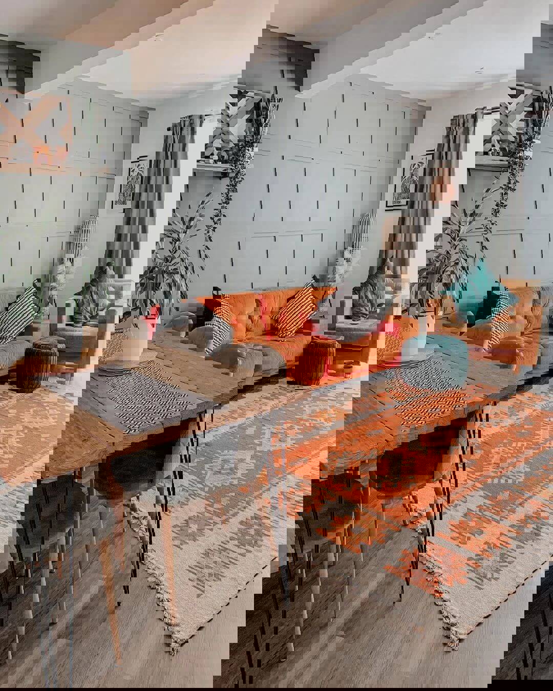Even small corners can radiate warmth and cosiness. This beautiful balmy orange contrasts perfectly with the cool grey curtains, and the flashes of bright white accessories help tie the look together. It’s a cosy little nook rich with texture and colour.
