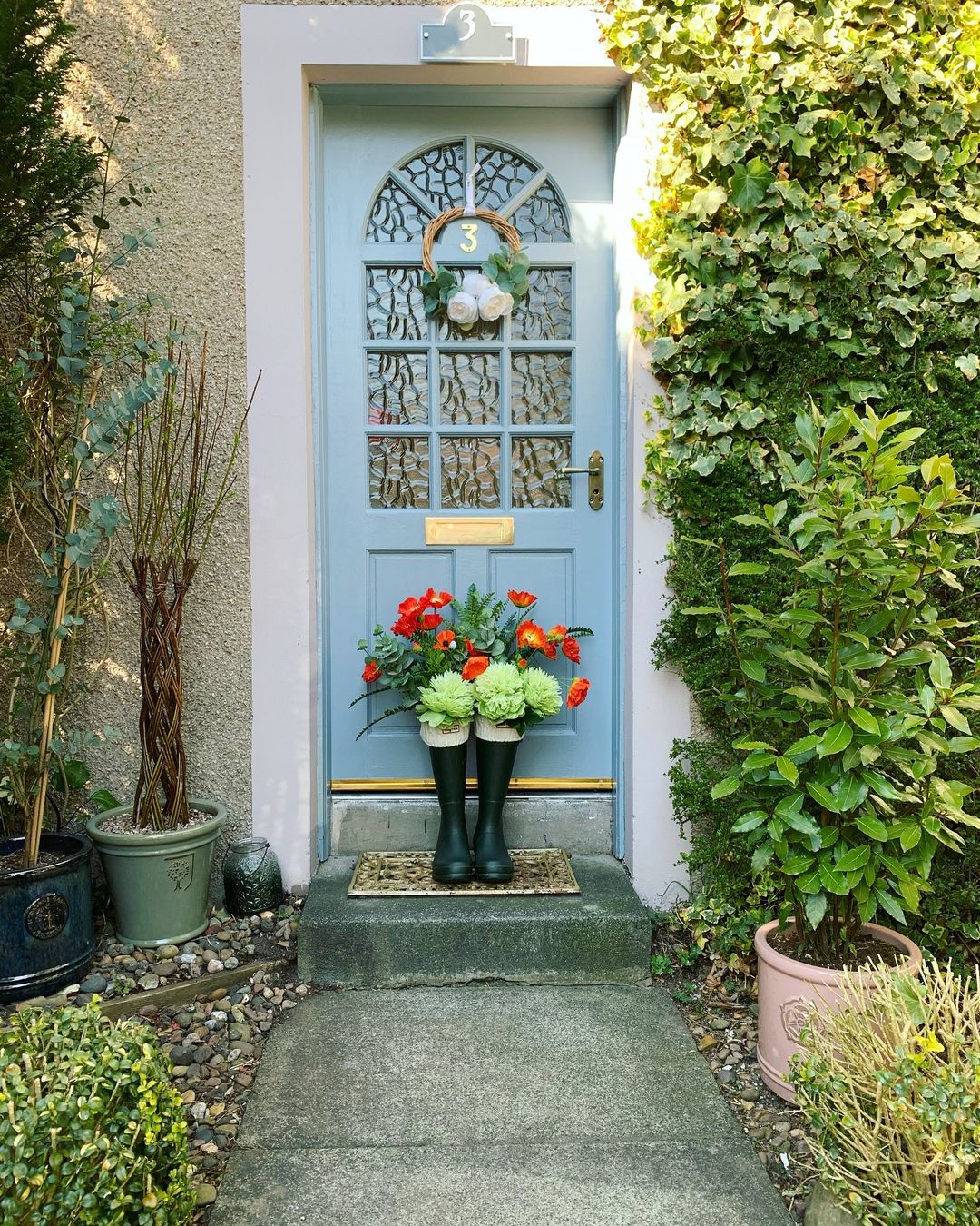 Choose a selection of pretty ceramic pots to complement your front door colour, and opt for evergreen plant varieties that will keep their colour throughout the year.
